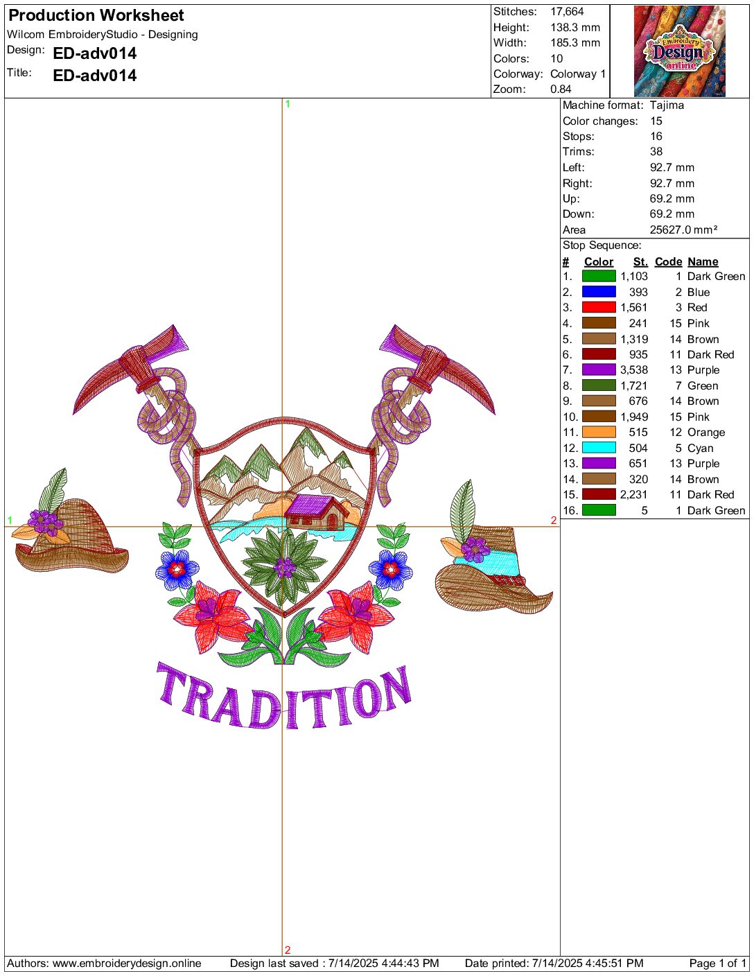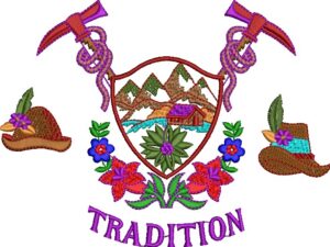 Tradition Alpine Embroidery Design: This rich embroidery design celebrates alpine tradition with a central shield featuring a mountain cabin, river,