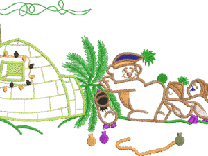 Arctic Igloo Bear Family Embroidery Design: This whimsical embroidery design features a cozy igloo with a glowing window, surrounded by
