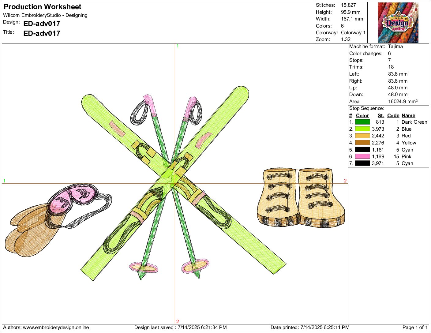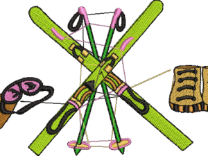 Ski Gear Adventure Embroidery Design: This vibrant embroidery design showcases a set of crossed skis with poles, accompanied by a