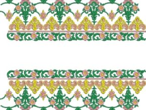 This sophisticated paisley neckline embroidery design features swirling paisley motifs in warm beige and brown tones, enhanced with teal/green striped
