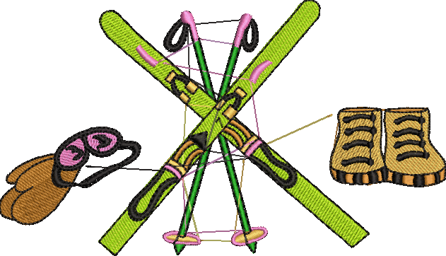 This vibrant embroidery design showcases a set of crossed skis with poles, accompanied by a pair of ski boots, gloves, and goggles. The bright green skis and colorful accents create a dynamic winter sports theme, perfect for outdoor enthusiasts or those looking to add a lively, alpine touch to their embroidery projects.