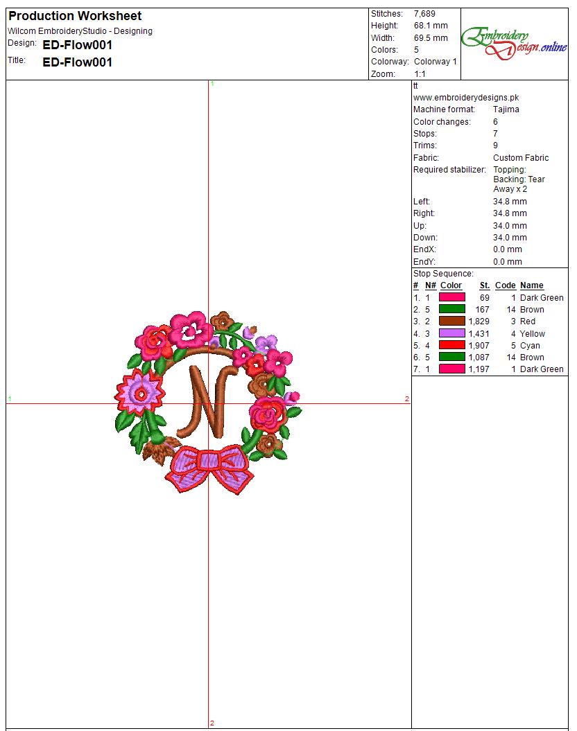 This beautiful machine embroidery design (ED-Flow001) showcases a stylish script monogram “N” surrounded by a lush circular wreath of blooming roses in shades of pink, magenta, purple, and red, with detailed green leaves and delicate brown accents. A charming purple ribbon bow ties it all together at the base, adding a touch of elegance and femininity.