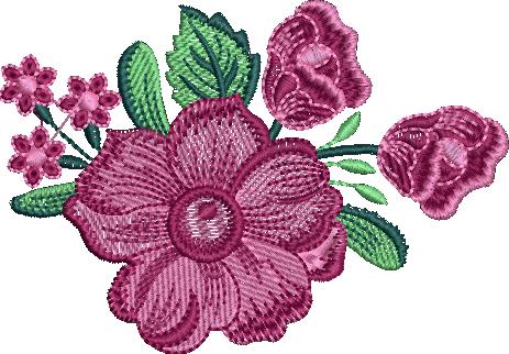 This delightful machine embroidery design (ED-Flow009) presents a lush cluster of pink flowers centered around a bold, open wild rose with layered petals and a detailed center. It includes two additional full-bloom roses, delicate smaller pink blossoms on stems, and beautifully veined green leaves for a natural, garden-inspired look. The soft pink shades create a sweet, feminine, and romantic vibe.