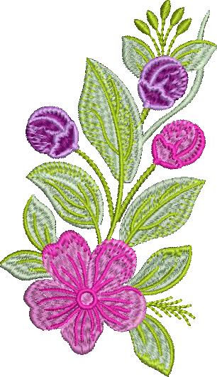 This graceful machine embroidery design (ED-Flow015) showcases a lovely vertical floral spray with a prominent large pink open flower with layered petals and textured center, surrounded by three rosebuds in shades of deep purple and bright magenta. Delicate light green and lime leaves with subtle veining add freshness and elegance to the slender, curving stems.