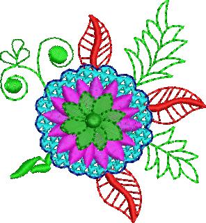 This striking machine embroidery design (ED-Flow023) features a captivating fantasy flower with dramatic layered petals in vivid magenta, turquoise cyan, lime green, and deep blue edges, centered by a textured green hub. Stylized foliage includes delicate fern-like green fronds, bold red-veined leaves, and playful curling green spirals, creating a lively, modern floral motif full of color and movement.