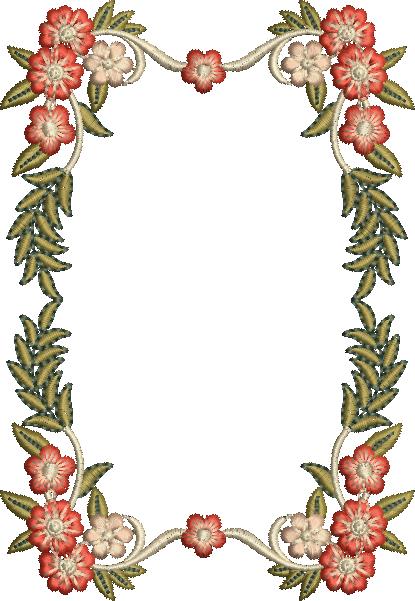 This charming machine embroidery design (ED-Flow027) creates a beautiful open rectangular frame with softly curving corners, ideal for enclosing monograms, names, or central motifs. The border is adorned with delicate clusters of red and soft cream flowers in various sizes, linked by graceful cream swirling vines. Richly detailed fern-style leaves in shades of green and olive add lush texture and a natural, vintage-inspired elegance.