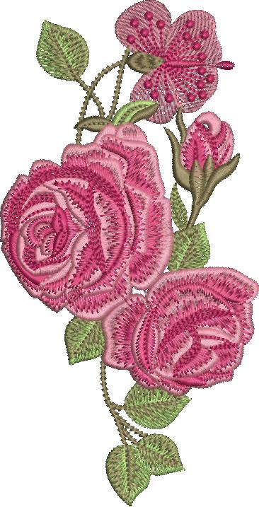 This beautiful machine embroidery design (ED-Flow029) showcases a graceful floral cluster with two richly detailed full-bloom roses in soft to deep pink shades, complemented by a delicate pink hibiscus-style flower with dotted stamens at the top and a classic rosebud on the side. Lush green leaves with fine veining and slender curving stems add natural movement and a fresh, romantic touch to the arrangement.