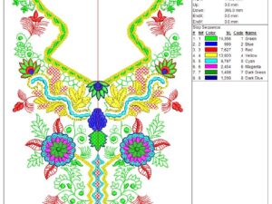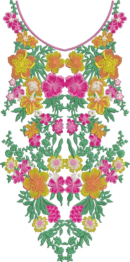 Celebrate vibrant tradition with this breathtaking machine-embroidered neckline (gala) design, perfect for kurtas, suits, Anarkalis, tunics, or festive dresses. The design features a generous V-shaped layout overflowing with large, multi-layered flowers in cheerful hues, delicate smaller blossoms, rich green foliage, twisting stems, and symmetrical cascading clusters that create a lively, balanced, and richly textured floral symphony—delivering an exuberant, joyful, and eye-catching appearance full of natural beauty and festive charm.